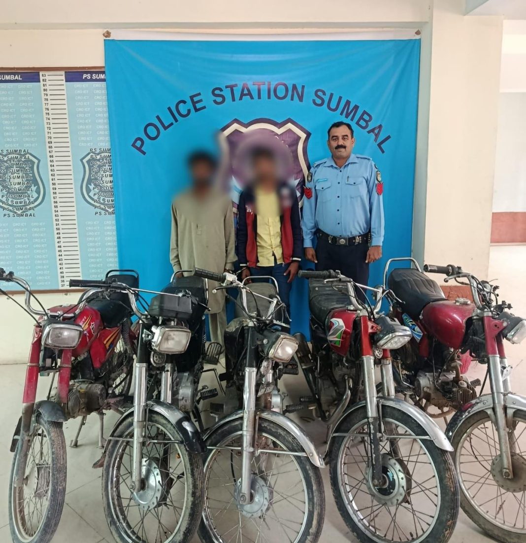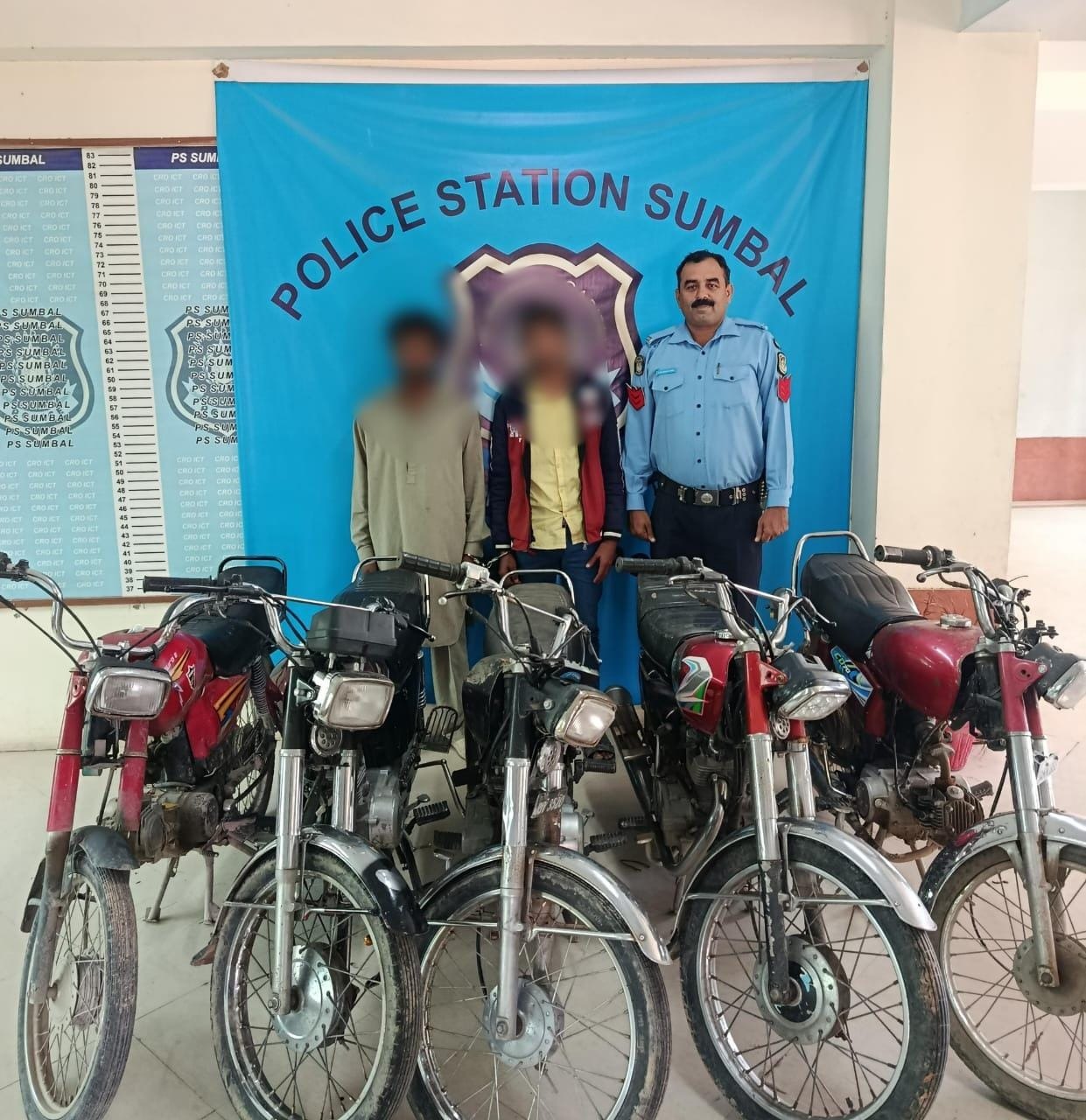 In this regard, the Sumbal Police Station team used modern technical tools and human intelligence to arrest key members of an organized gang involved in multiple motorcycle thefts. Police teams also recovered five stolen motorcycles from their possession. The accused have been identified as *Mohsin* and *Ahad Sohail*. Cases have been registered against them. During the initial investigation, the accused confessed to committing several thefts in Sumbal and surrounding areas. Further investigation is underway.