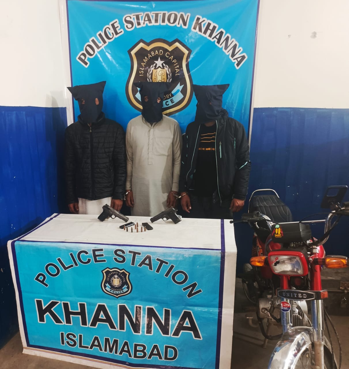 ISLAMABAD: Islamabad Police team from Khanna police station apprehended three members of an organized criminal gang wanted in several snatching activities. The arrested accused were identified as Arif, Israr, and Ishrat. Cases have already been registered against them. Police team also recovered weapons with ammunition and a motorcycle used in the crimes from their possession.