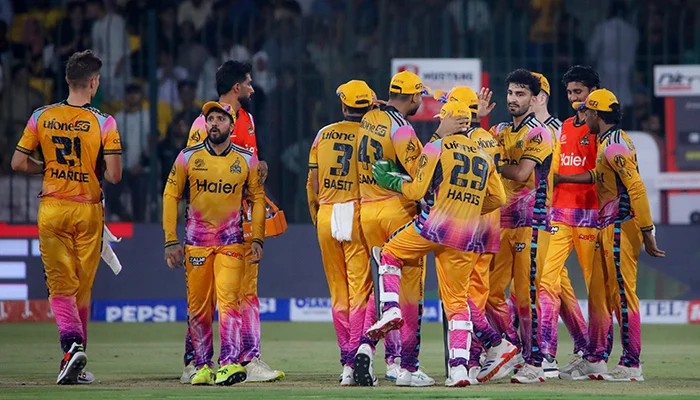 Peshawar Zalmi players celebrate a wicket during the PSL 11 Qualifier against Islamabad United at National Bank Stadium, Karachi, on April 28, 2026. –Agencies
